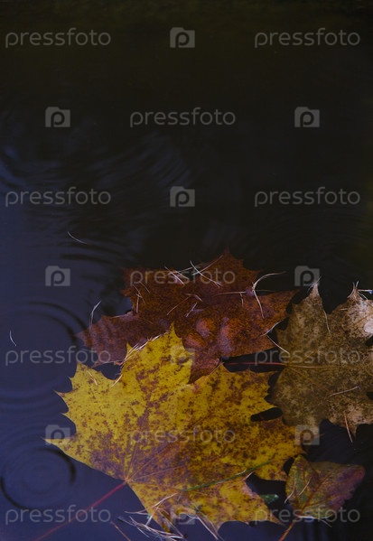 Желтые кленовые осенние листья на воде под дождем