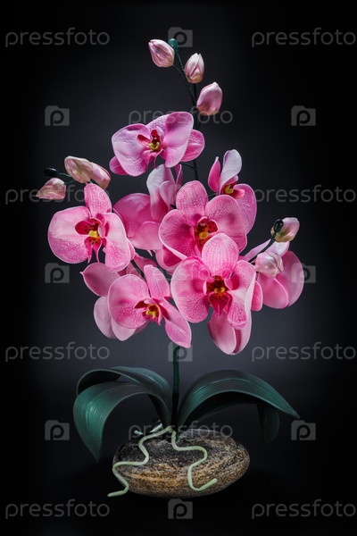 Искусственная орхидея на подставке из натурального камня на темном фоне. Рукоделие и хобби