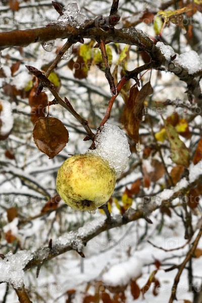 Ледяное яблоко висит на ветке дерева в саду после первого снегопада