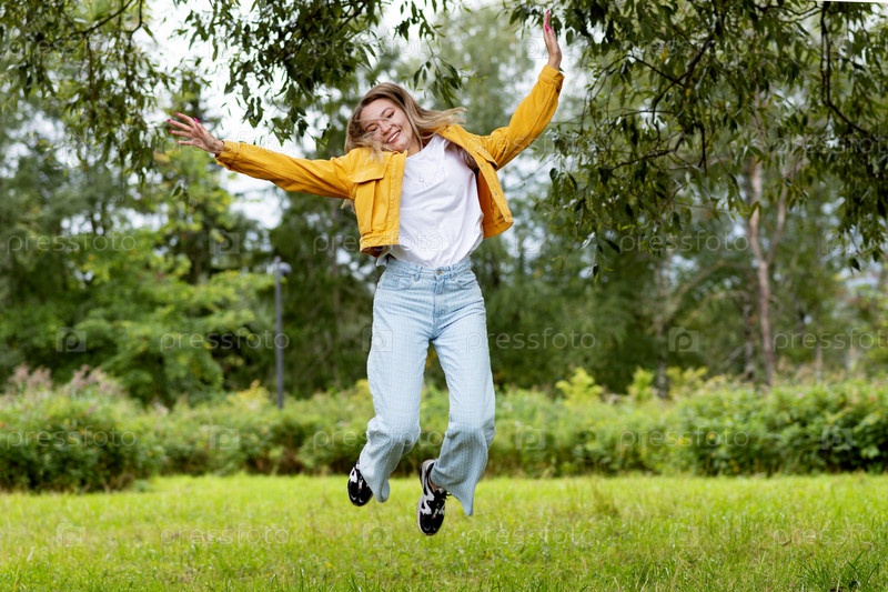 Открытый портрет молодой девушки, прыгающей в парке