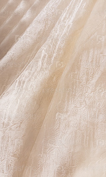 Вертикальный вид на шикарные мягкие складки фабричной ткани с орнаментом. бежевый, цвет шампанского, слоновая кость, кремовый. свадебная ткань абстрактный фон