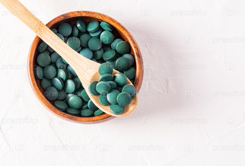 Крупный план зеленых таблеток полезных водорослей спирулины на деревянной ложке в деревянной миске, наполненной таблетками. Вид сверху. Детокс