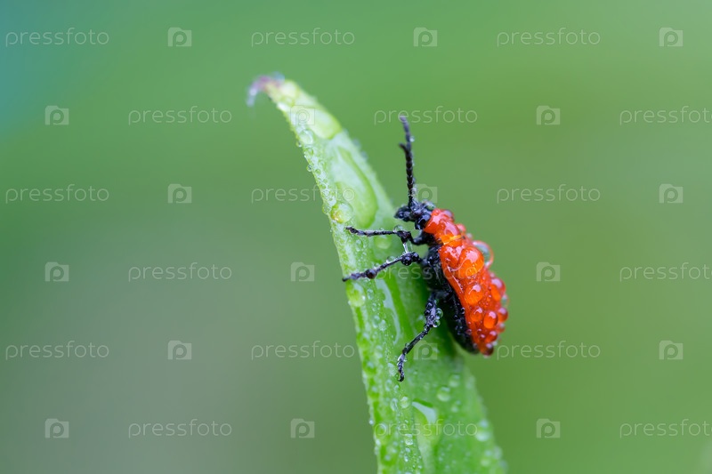 Жук лилейник в каплях воды