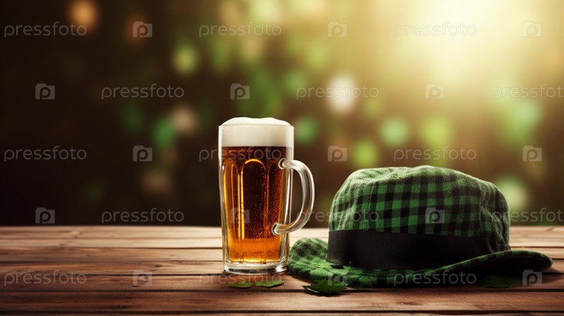 На деревянном столе стоит кружка пива, рядом зеленая шляпа и зеленый трилистник