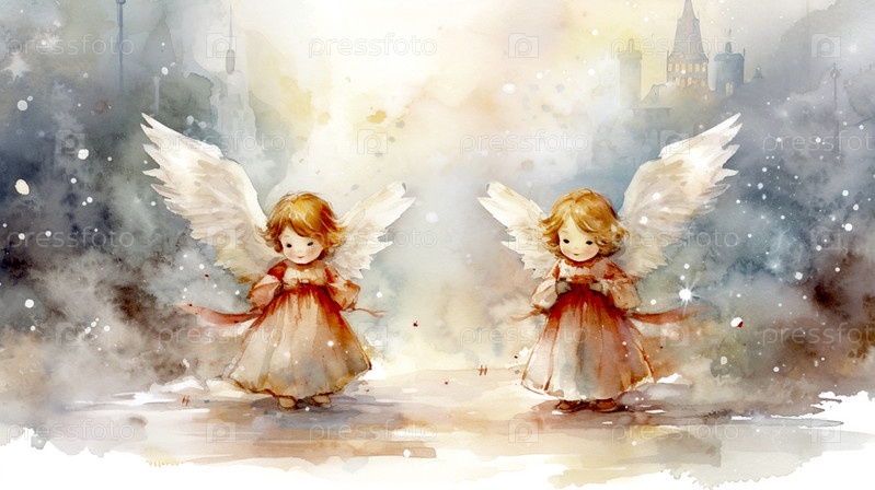 Акварельная рождественская открытка в стиле ретро с изображением двух рыжеволосых ангелов, спускающихся на землю