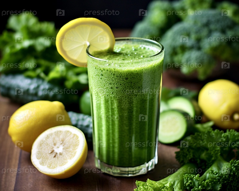На столе стоит стакан с зеленым коктейлем из огурца, лимона, шпината и витамина С