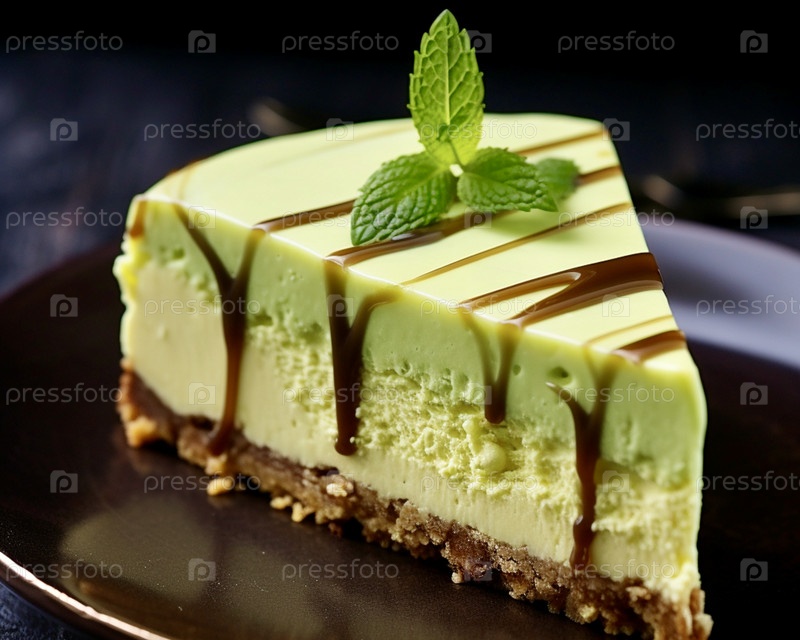 На коричневой тарелке лежит чизкейк с зеленым трилистником сверху