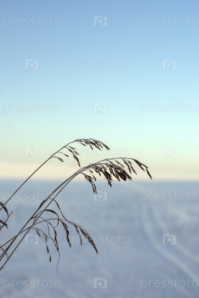 Трава, покрытая инеем, сфотографирована на фоне снежного поля