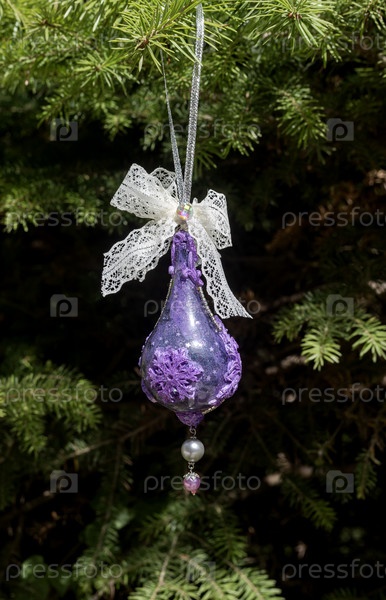Рождественская или новогодняя игрушка, висящая на еловой ветке крупным планом