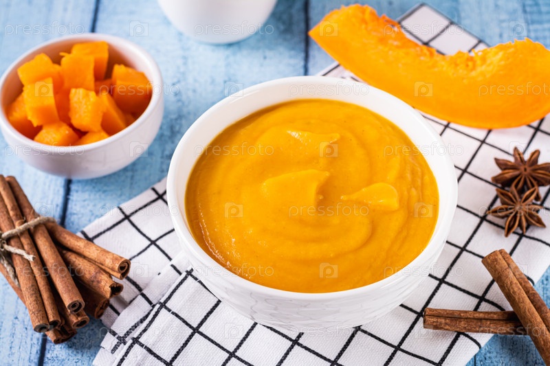 Органическое тыквенное пюре в миске, тыква и специи для приготовления на столе