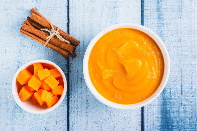 Крупный план домашнего тыквенного пюре с корицей в миске и кусочками тыквы, вид сверху