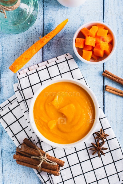 Органическое тыквенное пюре в миске, тыква и специи для приготовления сверху и вертикального вида
