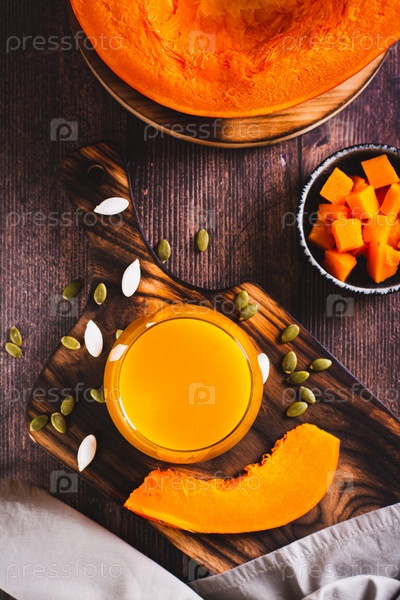 Стакан органического тыквенного сока, семена и кусочки тыквы на столе и вертикальный вид