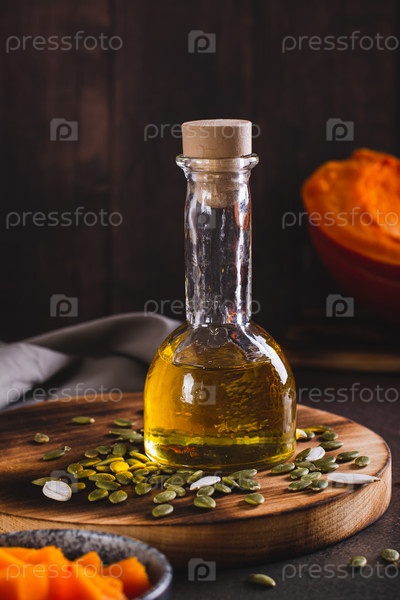 Свежее тыквенное масло и кусочки тыквы на столе, вертикальный вид