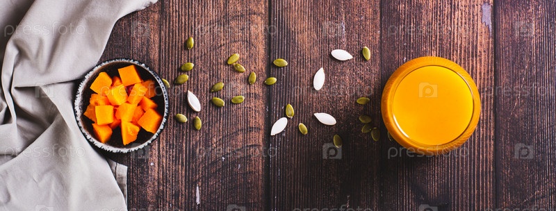 Стакан органического тыквенного сока, семена и кусочки тыквы на столе, вид веб-баннера
