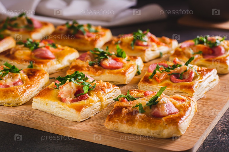 Мини-пицца с сосисками, помидорами, сыром и зеленью на деревянной доске на столе