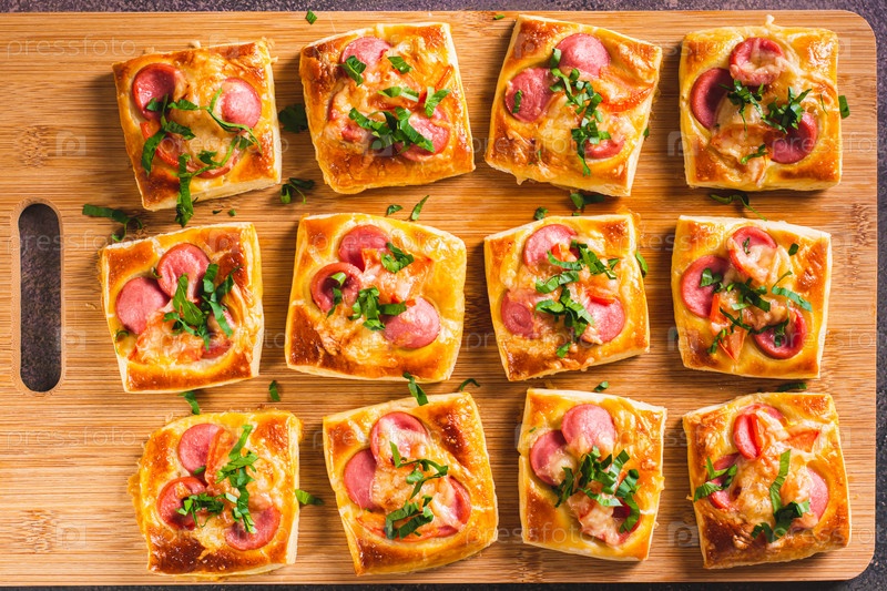Крупный план мини-пиццы с сосисками, помидорами, сыром и зеленью на деревянной доске, вид сверху