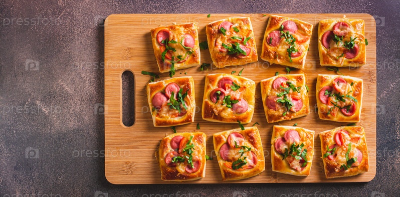 Закусочная мини-пицца с сосисками, помидорами и сыром на деревянной доске, вид сверху, веб-баннер