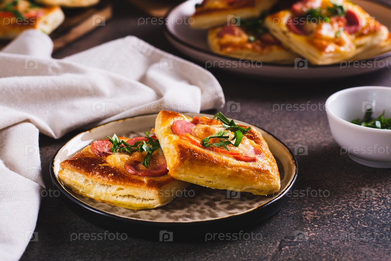 Квадратная мини-пицца с помидорами, колбасой и сыром на тарелке для закуски