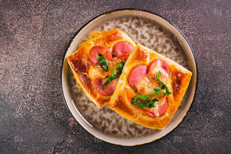 Крупным планом квадратная мини-пицца с помидорами, колбасой и сыром на тарелке для закуски, вид сверху