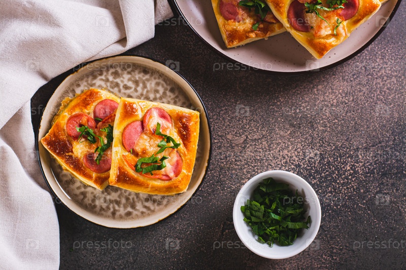 Квадратная мини-пицца с помидорами, колбасой и сыром на тарелке для закуски, вид сверху