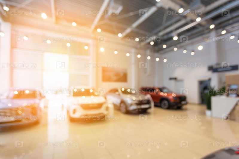 Размытый новый автомобиль, припаркованный в современном выставочном зале в ожидании продаж