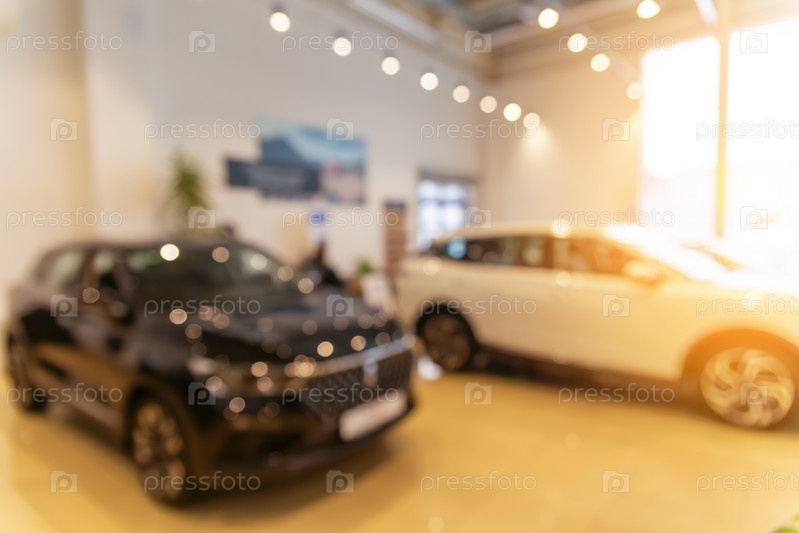 Размытый новый автомобиль, припаркованный в современном выставочном зале в ожидании продаж. Абстрактный фон размытого места автосалона новых автомобилей