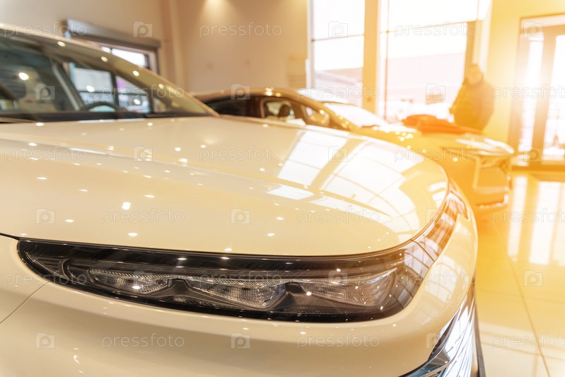 Размытый новый автомобиль, припаркованный в современном выставочном зале в ожидании продаж. Абстрактный фон размытого места автосалона новых автомобилей