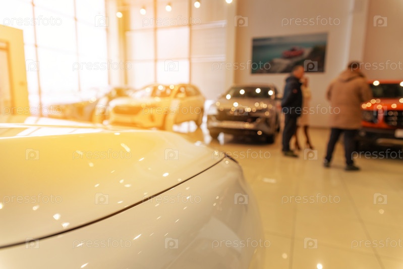Размытый новый автомобиль, припаркованный в современном выставочном зале в ожидании продаж. Абстрактный фон размытого места автосалона новых автомобилей