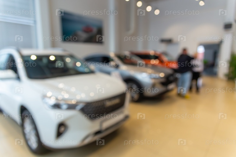 Размытый новый автомобиль, припаркованный в современном выставочном зале в ожидании продаж. Абстрактный фон размытого места автосалона новых автомобилей