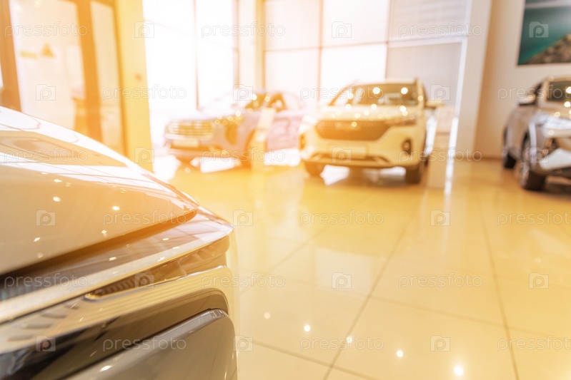 Размытый новый автомобиль, припаркованный в современном выставочном зале в ожидании продаж
