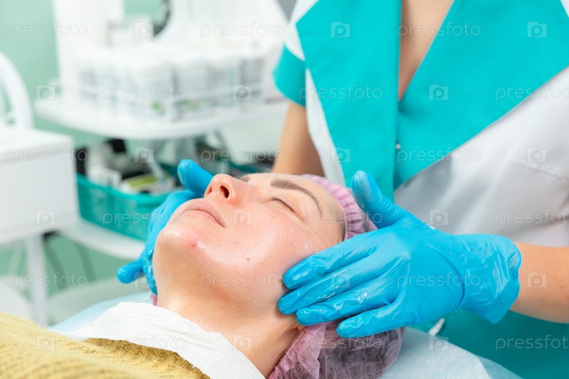 Женщина-косметолог вручную обрабатывает кожу пациента увлажняющим и тонизирующим гелем