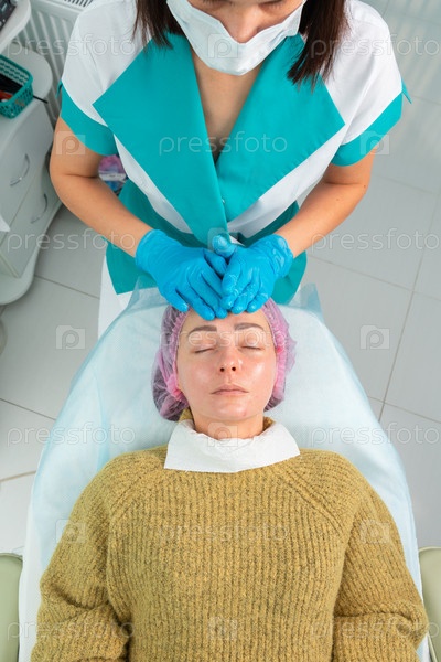Женщина-косметолог вручную обрабатывает кожу пациента увлажняющим и тонизирующим гелем.Процедура помогает контролировать баланс жировых отложений, восстанавливает pH-баланс кожи, дарит ощущение свежести и мягкости