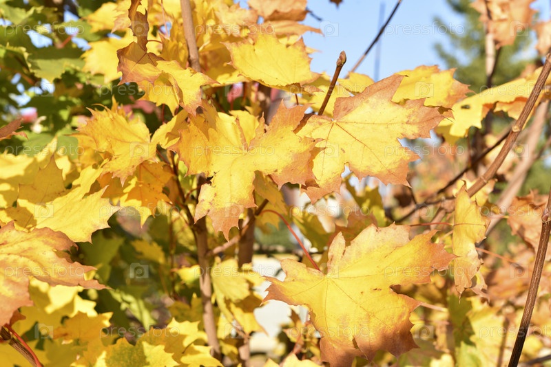 Желто-красные кленовые листья в свете осеннего солнца. Красивые осенние листья деревьев