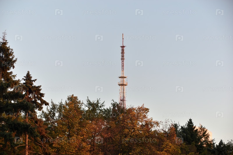 Телебашня на фоне осенних деревьев. Железное высокое сооружение в городе