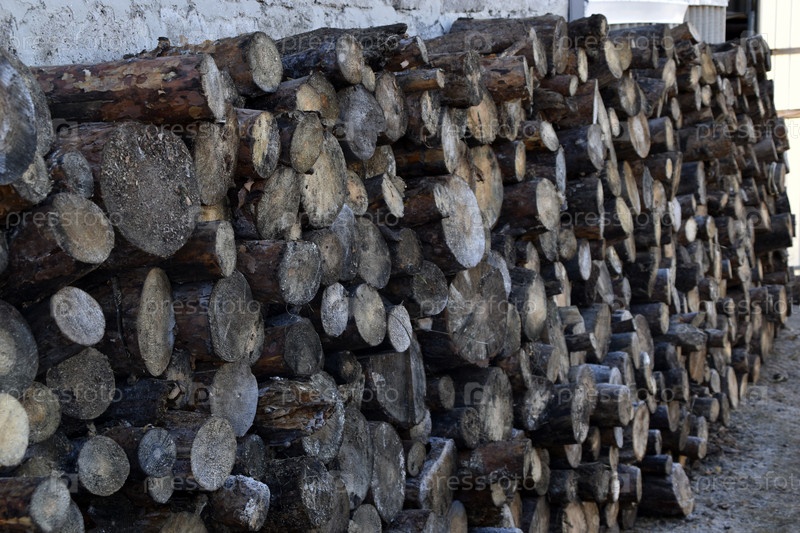 Распиленные бревна уложены у стены. Дрова для растопки. Распиленная древесина сосна
