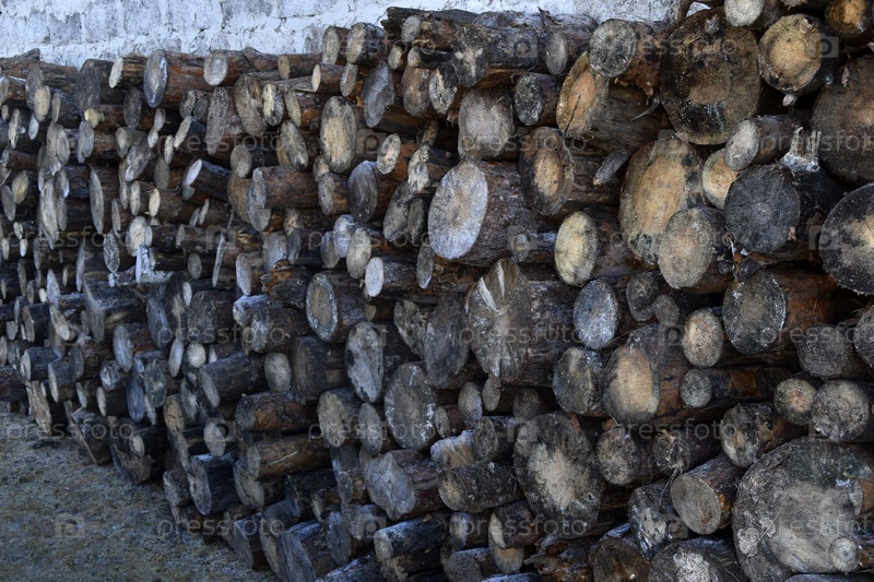 Распиленные бревна уложены у стены. Дрова для растопки. Распиленная древесина сосна
