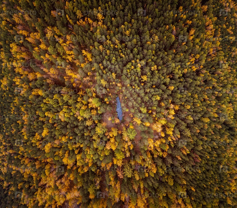 Осенний лес и небольшое озеро с высоты птичьего полета