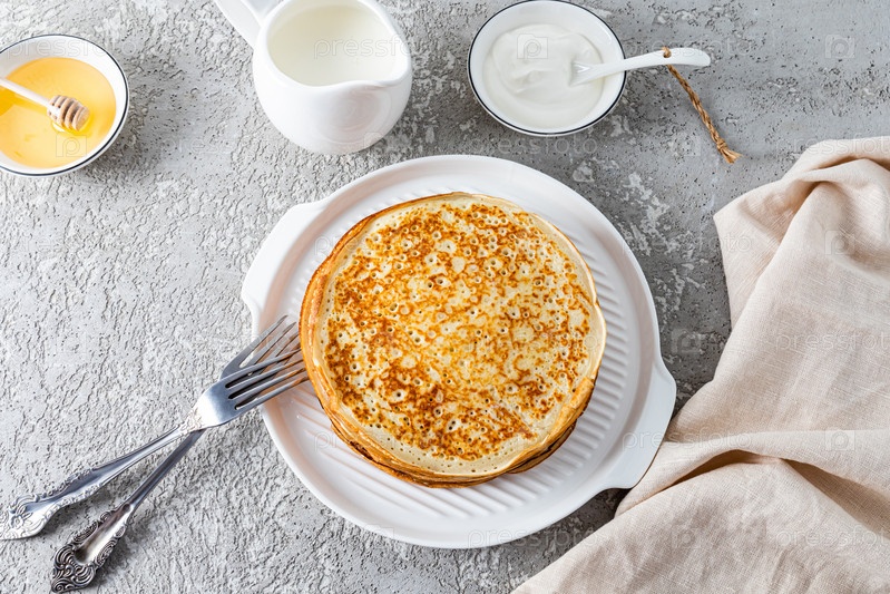 Вид сверху на стопку вкусных блинов на белой рельефной тарелке, столовые приборы, сметану, мед в мисках. Праздничный традиционный завтрак
