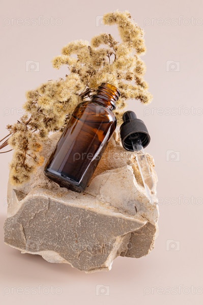 Открытая бутылка косметического продукта и наполненная им пипетка лежат на большом натуральном бежевом камне с сухой веткой растения. Антивозрастной уход