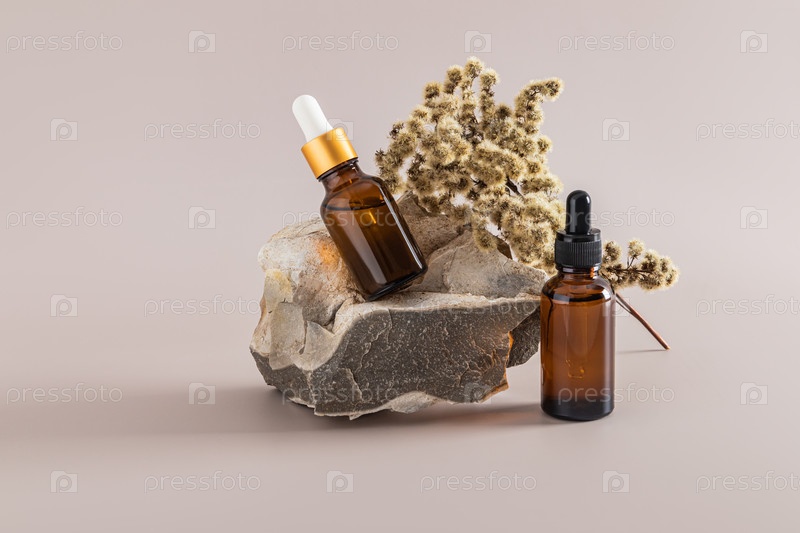 Косметические флаконы из янтарного стекла с капельницей на большом натуральном камне с сухой веткой. Антивозрастной уход. Интенсивное увлажнение сухой кожи