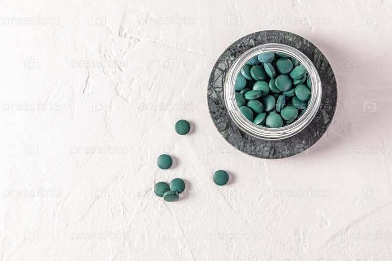 Стеклянная банка с таблетками зеленых водорослей спирулины на мраморной круглой зеленой подставке. Вид сверху. Копия помещения. Натуральная пищевая добавка