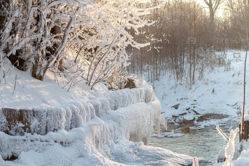 Замерзшие деревья на озере зимой в солнечный день