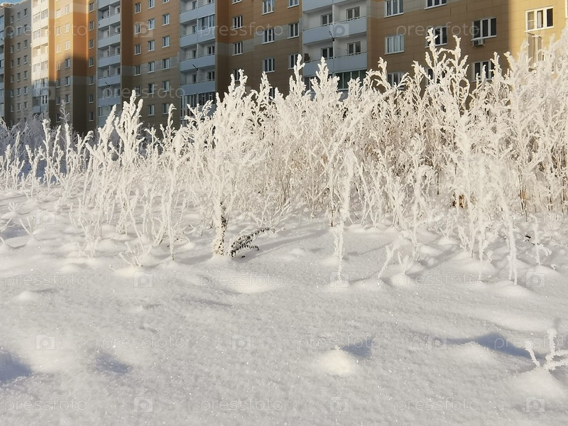 В солнечный зимний день кусты и трава перед домом были покрыты инеем и снегом после сильной метели и мороза. Селективный фокус