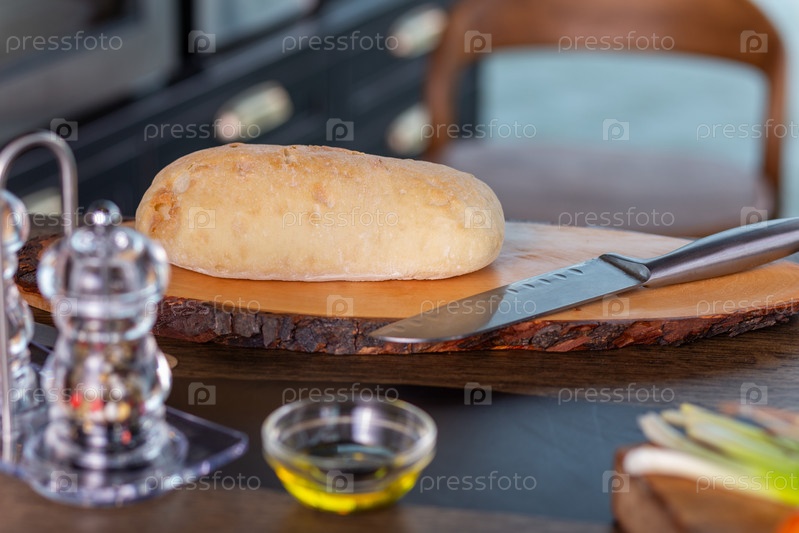 Свежий хлеб и ингредиенты для приготовления закусок на столе. Интерьер современной кухни с прозрачной стеной, за которой видна гладь озера