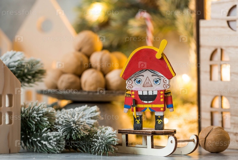 Игрушечный солдатик Щелкунчик и грецкие орехи на рождественском фоне с гирляндой. Балет Чайковского. Рождественская новогодняя открытка 2024
