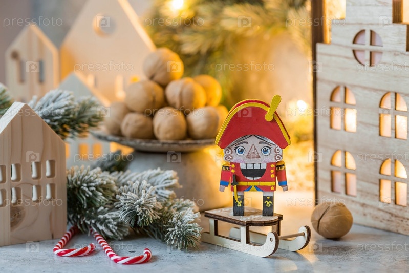 Игрушечный солдатик Щелкунчик и грецкие орехи на рождественском фоне с гирляндой. Балет Чайковского. Рождественская новогодняя открытка 2024