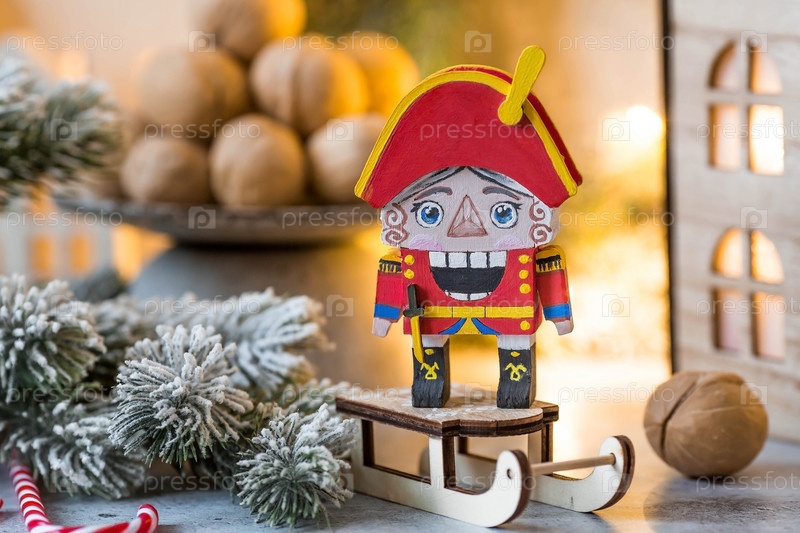 Игрушечный солдатик Щелкунчик и грецкие орехи на рождественском фоне с гирляндой. Балет Чайковского. Рождественская новогодняя открытка 2024