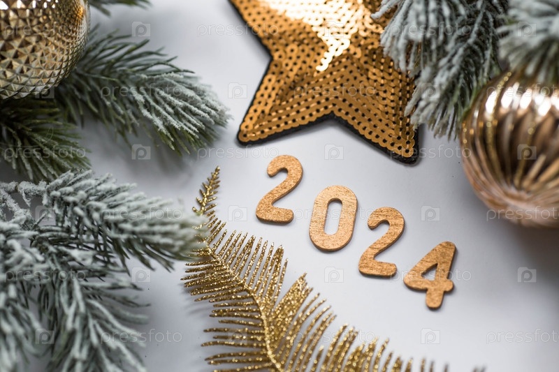 Баннер. С Новым годом и Рождеством. Золотые цифры 2024, снег, еловые ветки и елочные игрушки на белом фоне. Флаер. Приглашение