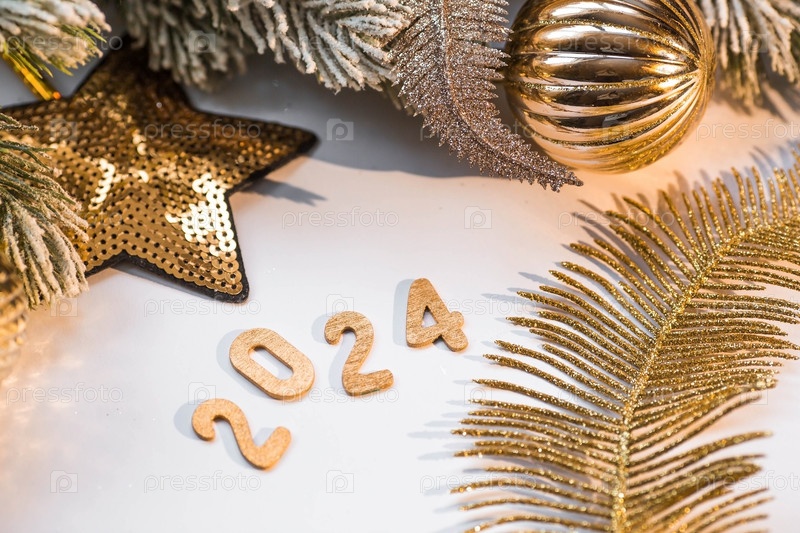 Баннер. С Новым годом и Рождеством. Золотые цифры 2024, снег, еловые ветки и елочные игрушки на белом фоне. Флаер. Приглашение